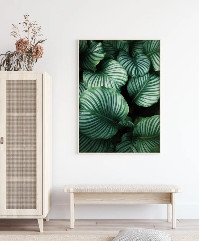 Et smukt luftfotoprint af mørke, grønne Calathea blade. Sollyset stråler ned på bladene og skaber et intenst lys. Forskellige grønne nuancer skaber en intens indstilling, hvilket gør dette print til et ideelt print til at hænge i en stue omgivet af planter.