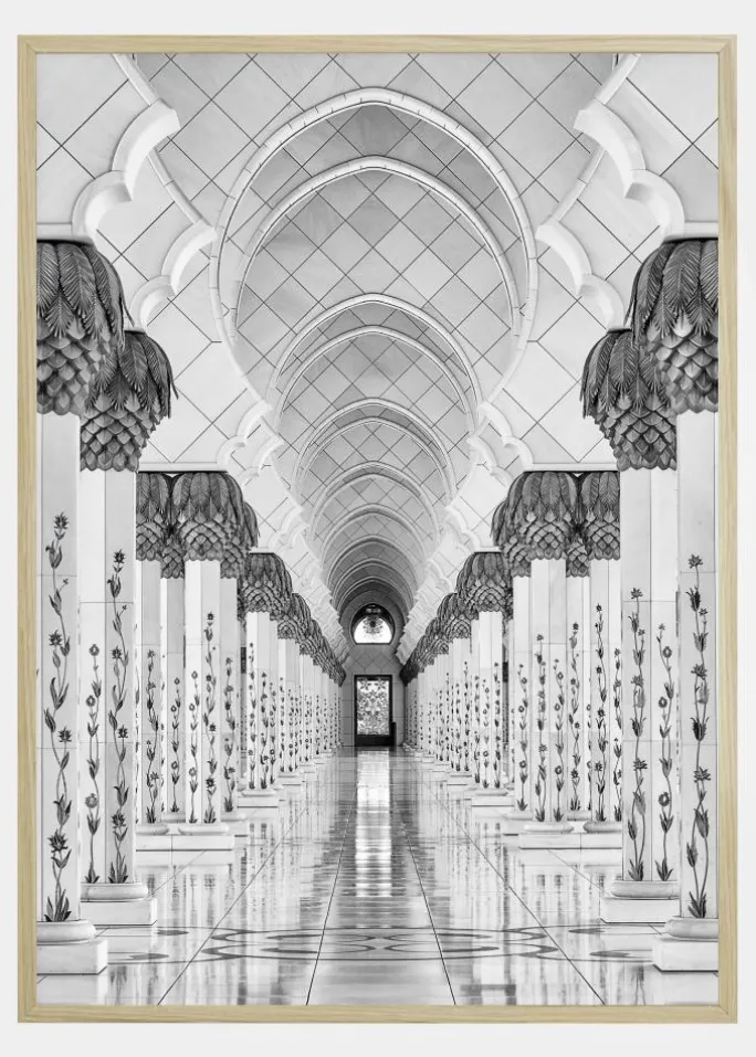 Et sort-hvidt illustionist print, der viser dybden. To rækker af søjler fører til en glasdør i det fjerne. Søjlerne er smukt dekoreret med blomster. Det naturlige lys skinner ind gennem glasdøren og skaber en refleksion af lys på gulvet. Hæng dette print op for at skabe en følelse af rum.