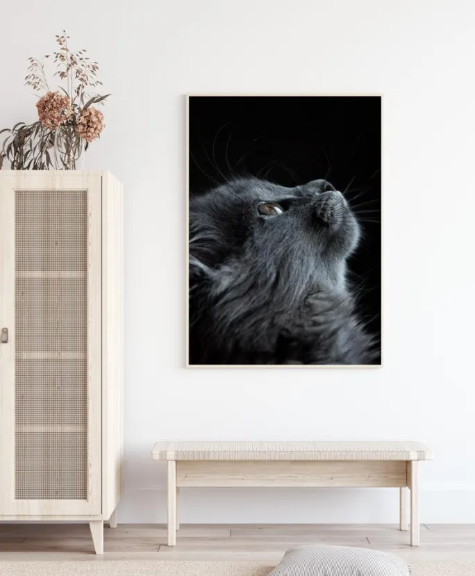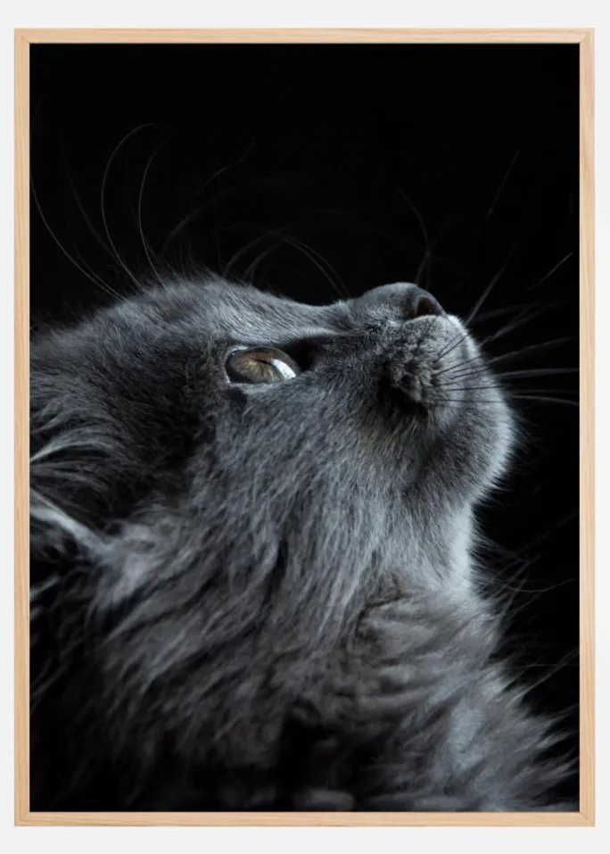 Et fantastisk kattekatteportræt af en yndig grå kattekilling, der stirrer opad. Lyset skinner på den grå killing, hvilket gør den mere synlig. Set på en sort sort baggrund spiller dagslyset en vigtig rolle. Følg kattens øjne og se, hvad den kigger på.