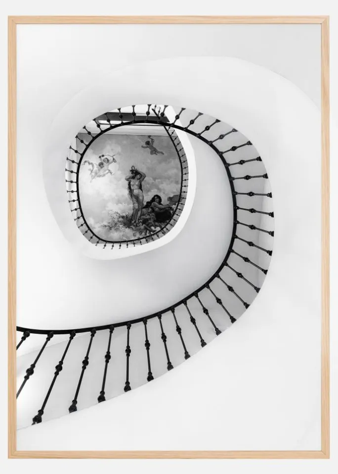 Et smukt sort-hvidt portræt af en vindeltrappe i sort og hvidt. Takket være et sort smedejernsgelænder fører denne smukke vindeltrappe dig op til et dejligt freskomaleri med nøgne kvinder og keruber. Ophængt på en almindelig hvid væg skaber dette print en følelse af uendelighed.