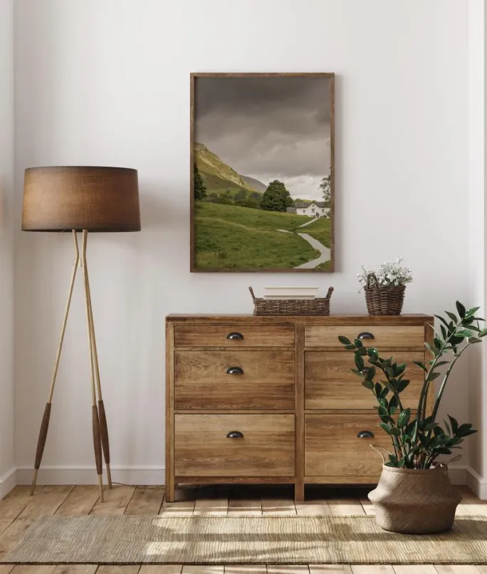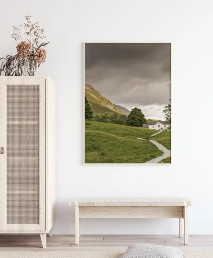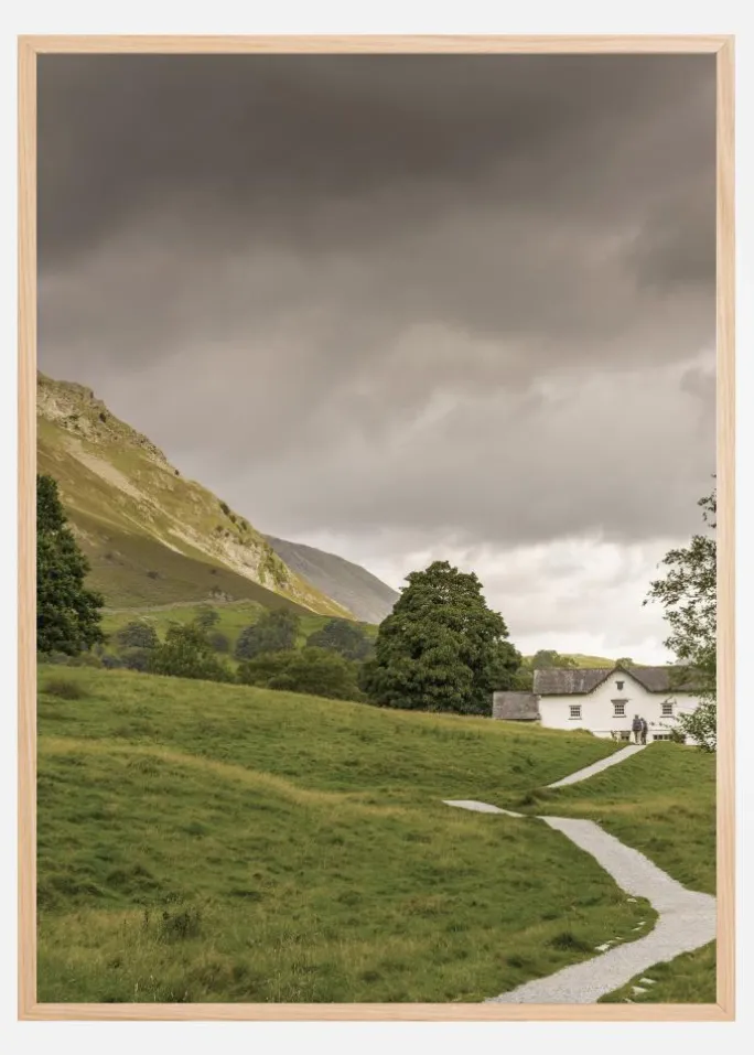Et stemningsfuldt print af et stort hvidt landhus, der ligger for enden af en hvid sti. En overskyet himmel skaber en mørk, men smuk atmosfære. Mærk roen i dette landskabsbillede og værdsæt den smukke natur i dette print.