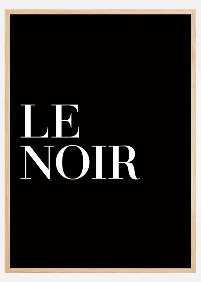 En enkel og minimalistisk tekstplakat med teksten “Le Noir”, Det sorte, i store hvide versaler mod en sort baggrund. En plakat der passer perfekt til at have på en større billedvæg, måske i kombination med plakaten “Le Blanc”, Den hvide? Suppler gerne med noget fra vores store sortiment af rammer.