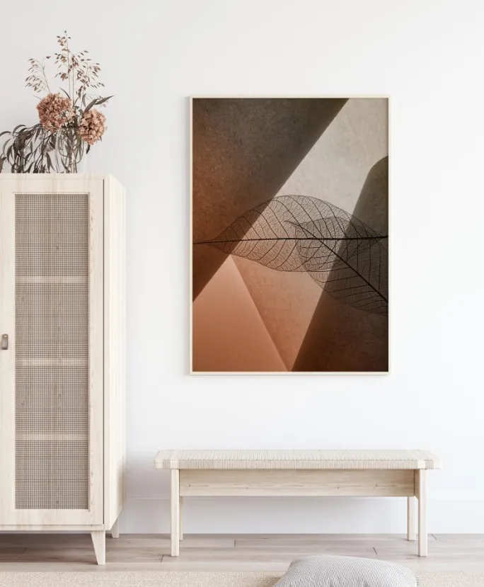 Et fantastisk billede af to blade gengivet mod sollyset. Lysstrålen fremhæver bladrenes årer. Det smukke billede er domineret af forskellige brune nuancer, mens baggrunden er præget af både ru og glatte partier, der reflekterer lyset. Et ideelt print til at give lys til et rum.