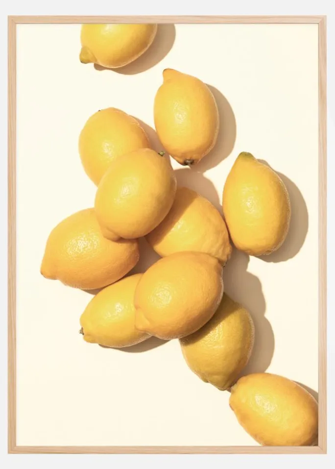 Et realistisk billede af en lund af citroner. Lyset fra oven projiceres direkte på frugten, hvilket fremhæver skrællens ruhed. Lyset skaber skygger, der strækker sig ud over den hvide baggrund. Duft citrusfrugtens friskhed, når du hænger dette print op i dit køkken.