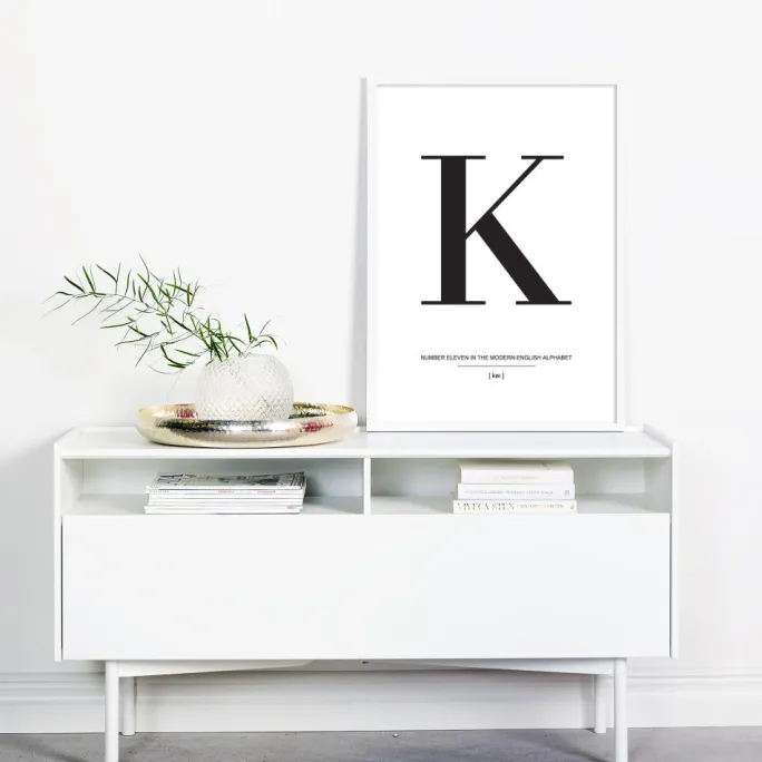 I enkelheden findes det smukke, og det beviser denne stilrene plakat med bogstavet K i sort mod en hvid baggrund virkelig. Printet har en flot typografi og bør komplementeres med andre bogstavsplakater fra samme serie for at skabe en trendy og smuk billedvæg. Vælg dine favoritplakater med bogstaver på og vælg blandt vores store sortiment af kvalitetsrammer, så er det bare at lade fantasien flyde derhjemme på væggene.