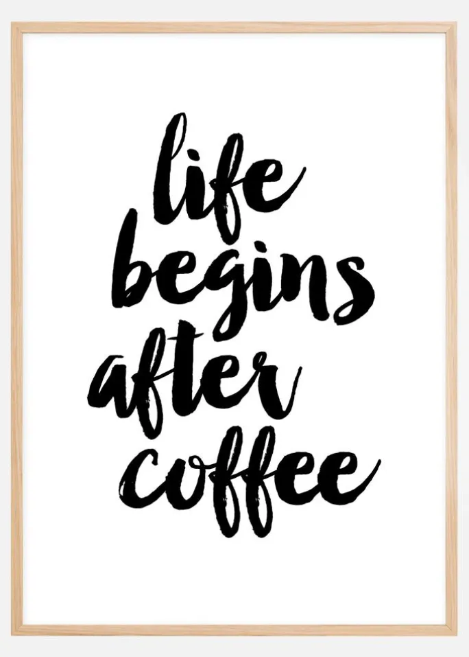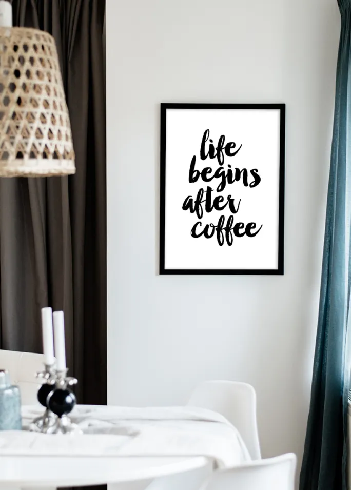 Du ved, at du vil gøre det godt på jobbet i dag, og at du bagefter endda vil have energi tilbage til at være sammen med familie og venner. Men faktum er, at før du kan gøre noget af dette, har du brug for en kop opkvikkende kaffe. Der er intet at skamme sig over! Hæng i stedet denne herlige plakat på væggen og nyd en kop af den vidunderlige drik. Posteren er hvid med et sort tryk i form af teksten ”Life begins after coffee” skrevet med en legesyg og krøllet skrifttype. Køkkenplakater bliver ofte meget smukke sammen med sølvfarvede rammer, som matcher vask, blandingsbatteri og andre metaldetaljer, der normalt findes i et køkken. Posteren findes i flere forskellige størrelser og prisklasser.