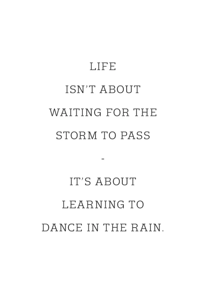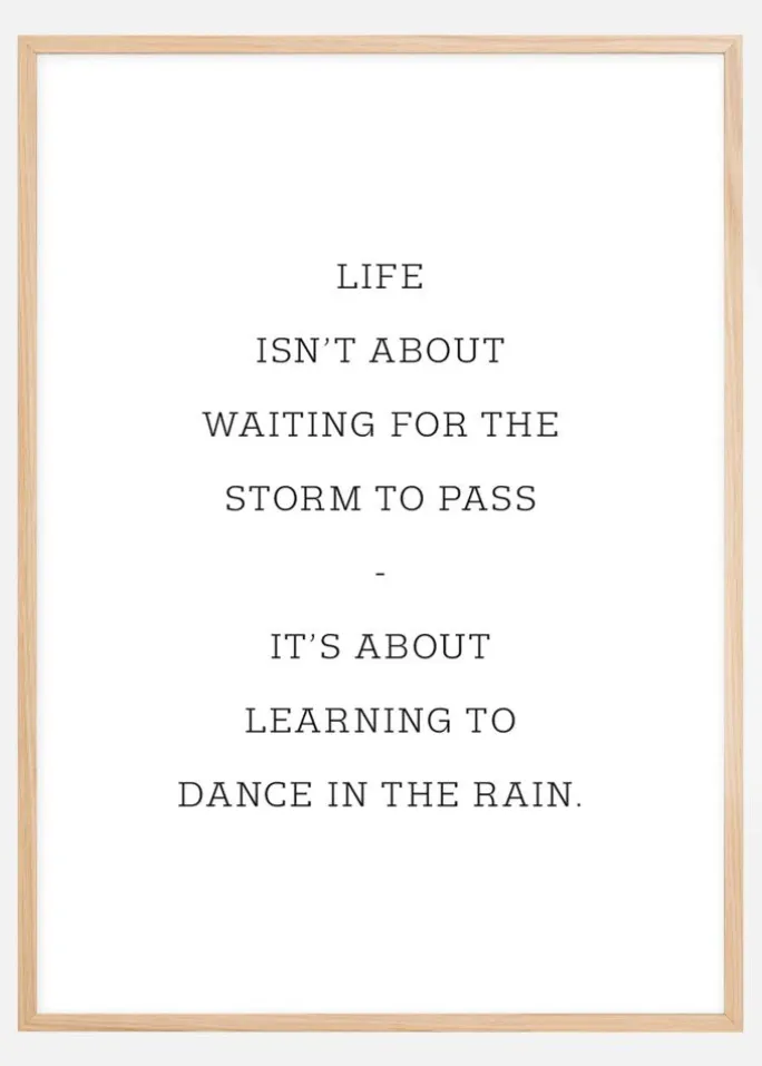 Et meningsfuldt sort-hvidt motivationsprint, der fremhæver vigtigheden af at se problemerne i øjnene. Skrevet med enkle, fede, sorte store bogstaver kommer budskabet klart frem. Livet handler ikke om at vente på, at stormen går over – det handler om at lære at danse i regnen. Et enkelt, men moderne billede til at hænge på en hvid væg.