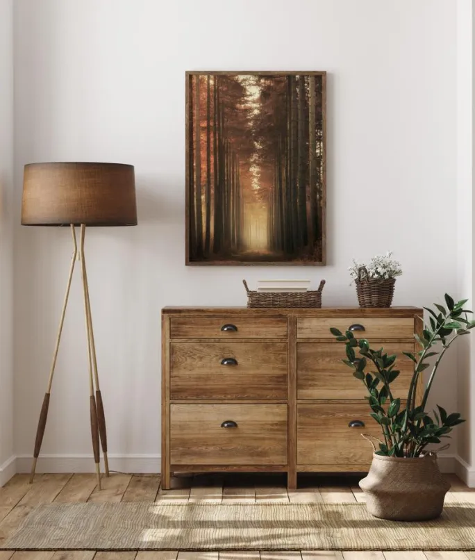 Et betagende naturprint af en smuk allé af høje træer. Det naturlige lys skinner gennem træerne og fremhæver de vidunderlige brune blade, hvilket skaber en følelse af varme og ro. Et absolut smukt print, der kan hænges op i ethvert miljø for at skabe varme, skønhed og ro.
