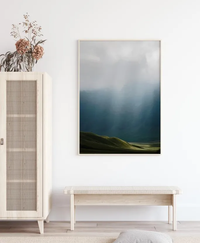 Et fantastisk landskabsbillede med de mørkegrønne bakker i forgrunden. De stigende bakker på den anden side er knap nok synlige på grund af den tidlige morgentåge. De bløde grønne og gråtoner skaber en beroligende og afslappende følelse. Et ideelt print til at hænge i en stue.