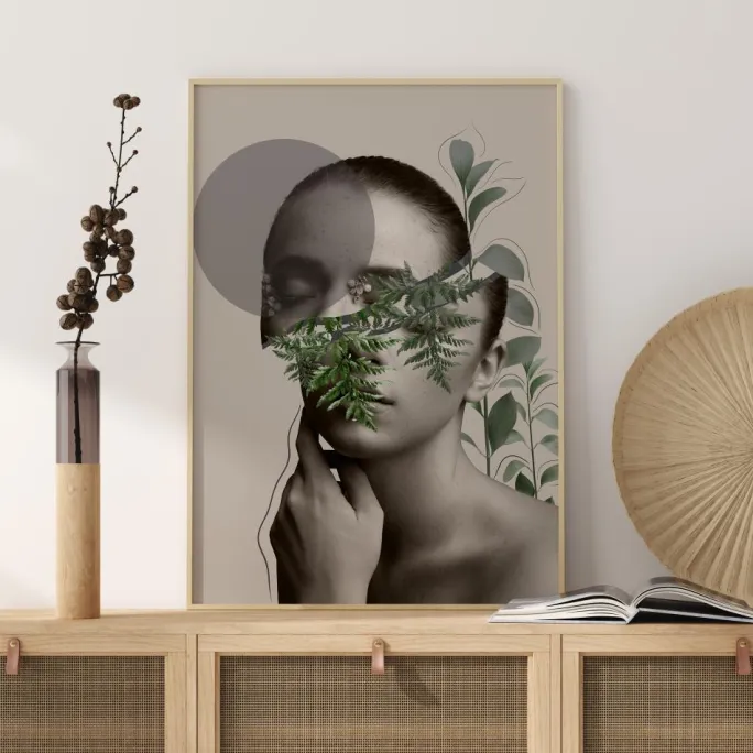 Dette smukke portræt er inspireret af decoupage-kunsten. Forskellige billeder er sat sammen for at skabe et moderne, stilfuldt kunstværk. Den unge pige på billedet er omgivet af smuk botanik, som skaber en følelse af fred og ro. Et ideelt maleri til et avantgarde soveværelse eller en minimalistisk stue.