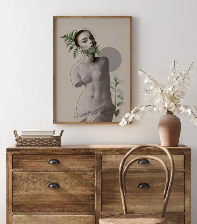 Et udtryksfuldt billede, der gør decoupage motivets skønhed. Hovedpersonen er en smuk kvinde omgivet af botanica på en gammel græsk statue. En delikat kontrast mellem moderne og antikke tidsaldre. Dette billede er et statement accent til en minimalistisk stue.