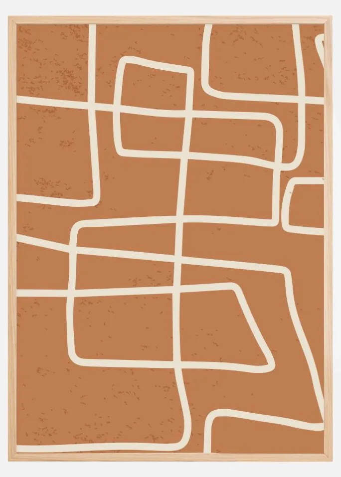 Denne minimalistiske og stilrene plakat præsenterer et netværk af rene linjer, der danner en slags abstrakt kort eller et kubistisk landskab. De beige linjer skærer gennem en varm terracottafarvet baggrund og skaber en følelse af orden og struktur mod et blødt tekstureret lærred. Dette er en print, der passer perfekt til den, der sætter pris på moderne design og de varmere farvespektre i sit hjem eller kontor.