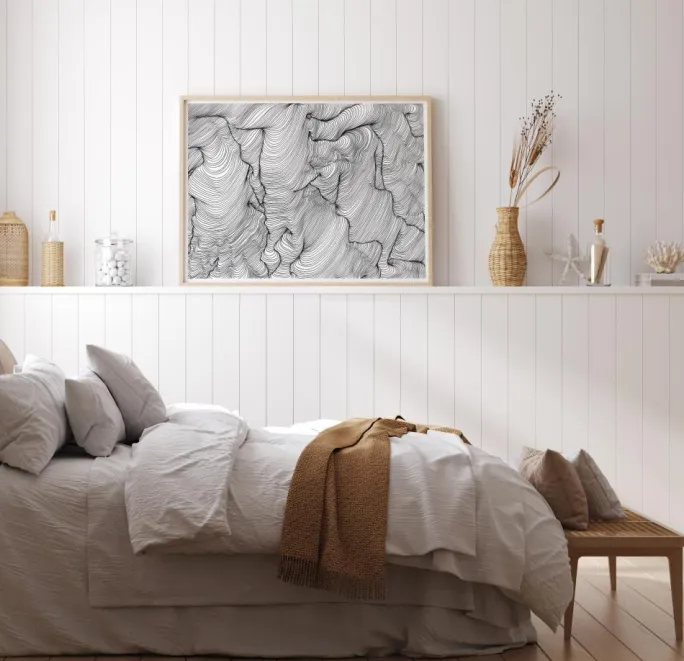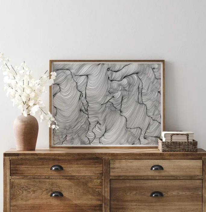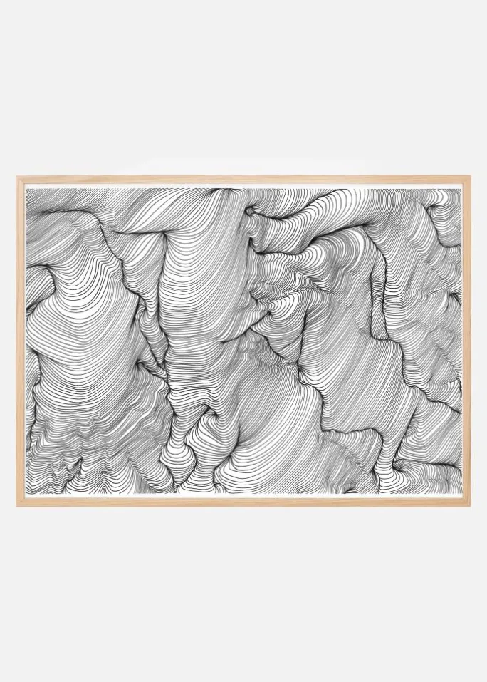 En abstrakt kunstplakat i sort blæk med bølgende linjer, der skaber spændende former, skabt af Belinda Hellberg, Hells Bells Sthlm. Motivet er omgivet af en lidt tyndere passepartout i hvid, som effektivt fremhæver dets indhold. En enkel og stilren plakat, der er let at kombinere med andre favoritter på en større væg.