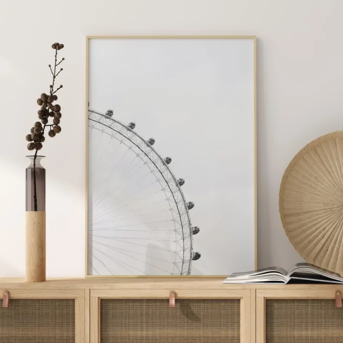 Et imponerende sort-hvidt print af London Eye. Med den grå Londonhimmel i baggrunden leder hjulets eger øjet hen til de ni passagerkabiner. Et virkelig imponerende print, der fremhæver denne storslåede tekniske konstruktion. Forestil dig udsigten fra en af disse kabiner.