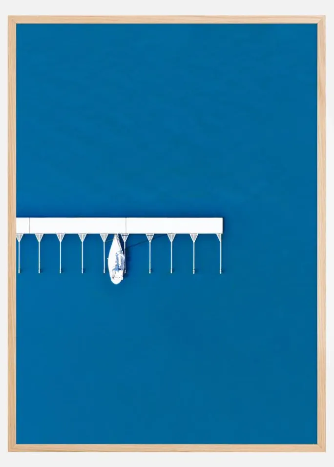 Dette kunstværk med titlen “Lonely Sail” skildrer en hvid sejlbåd, der har lagt til langs en brygge, der strækker sig over det klare, blå vand. Den kraftfulde kontrast mellem den minimalistiske hvide båds og bryggens rene linjer mod den dybt blå baggrund skaber en stærk visuel effekt, der fremhæver bådens isolation og den åbne vidder skønhed.