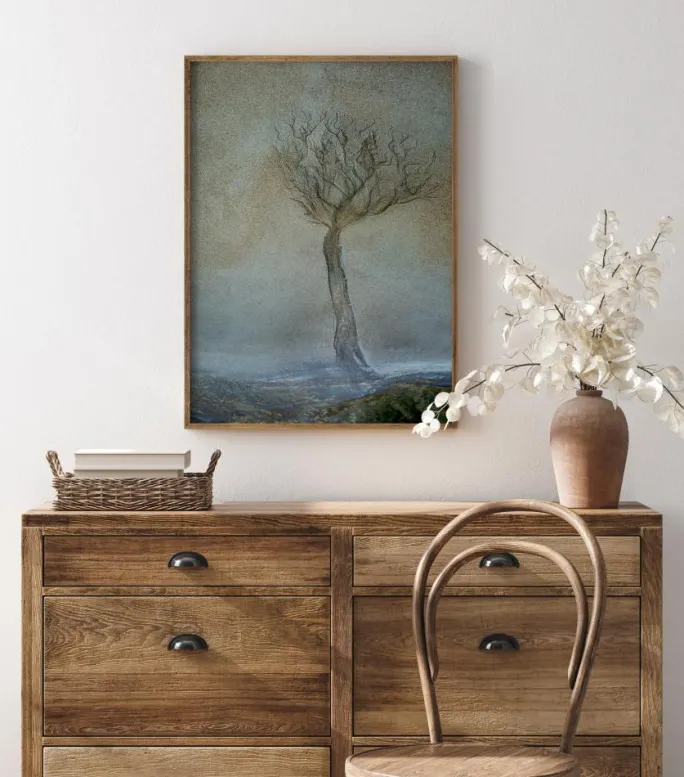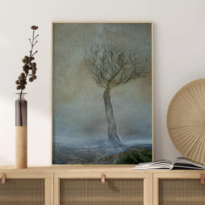 Et landskabsprint af et melankolsk ensomt træ. Trykket viser en svag panoramaudsigt over sletter med bakkerne i forgrunden. Et ensomt bladløst træ dominerer forgrunden. De bløde grå og brune farver skaber en melankolsk og fortabt følelse. Hæng dette print op i et roligt miljø.