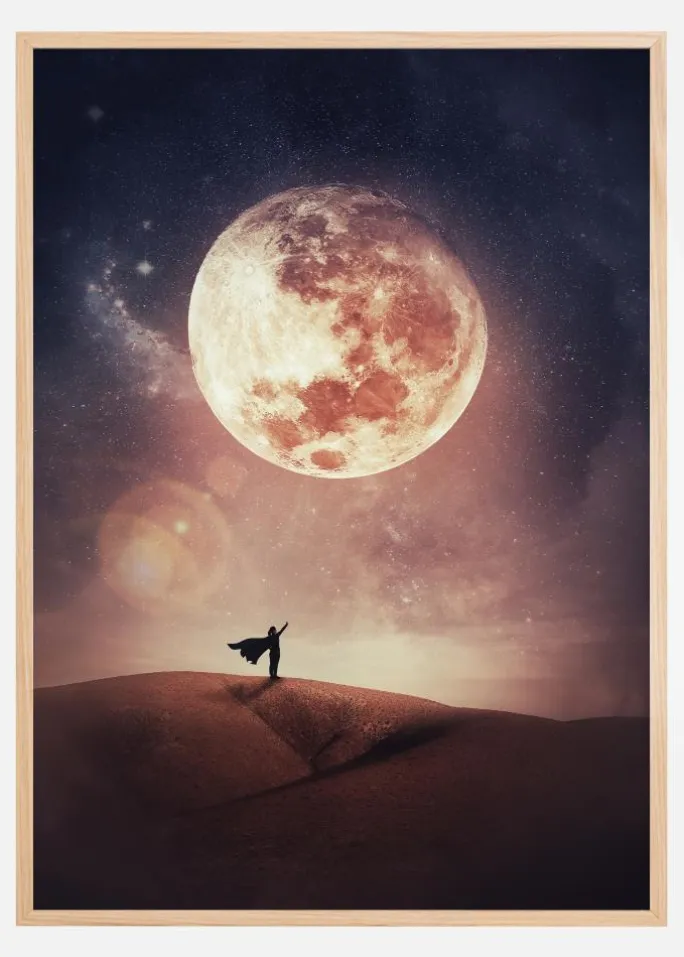 Denne drømmelignende plakat indfanger et magisk øjeblik, hvor en ensom figur står på en ørkenbakke og ser op mod en enorm, strålende måne omgivet af en stjernespækket himmel. Scenen er en stærk påmindelse om vores plads i universet, både ubetydelig og forunderlig. Den vækker følelser af længsel og nysgerrighed, inspirerer os til at tænke stort og til at drømme uden grænser.
