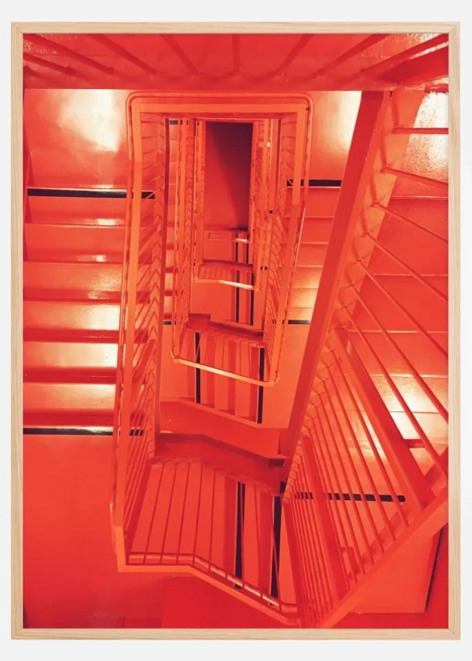 Denne plakat byder på en hypnotiserende geometrisk oplevelse, hvor en række spiraltrapper fanger dit øje og trækker det gennem et dyb af røde nuancer. Kontrasten mellem den dristige farvesætning og de stramme linjer giver et kraftfuldt indtryk, samtidig med at det skaber en følelse af uendelig dybde og perspektiv. Motivet udforsker arkitektur og design i en monokrom rød farvepalet, som både er dristig og fængslende.