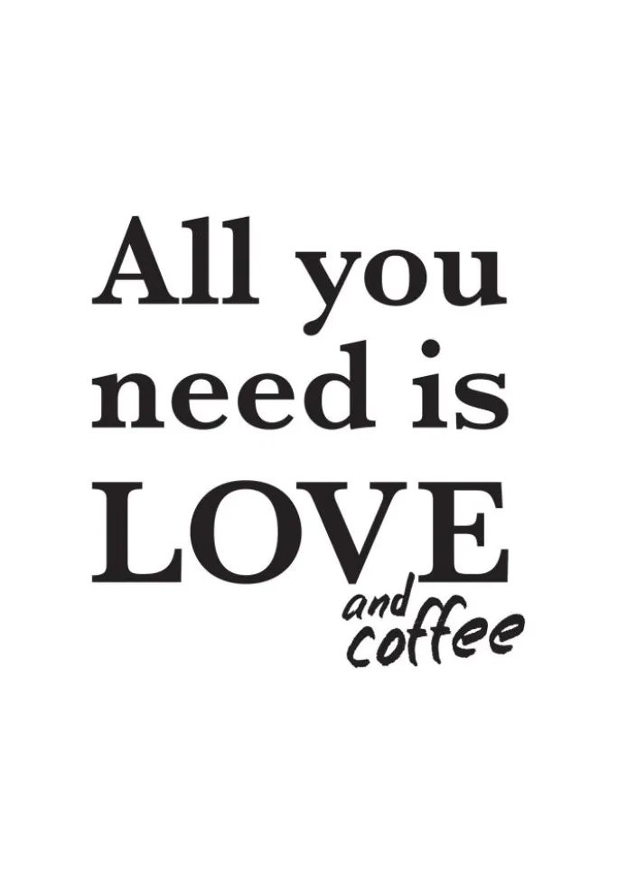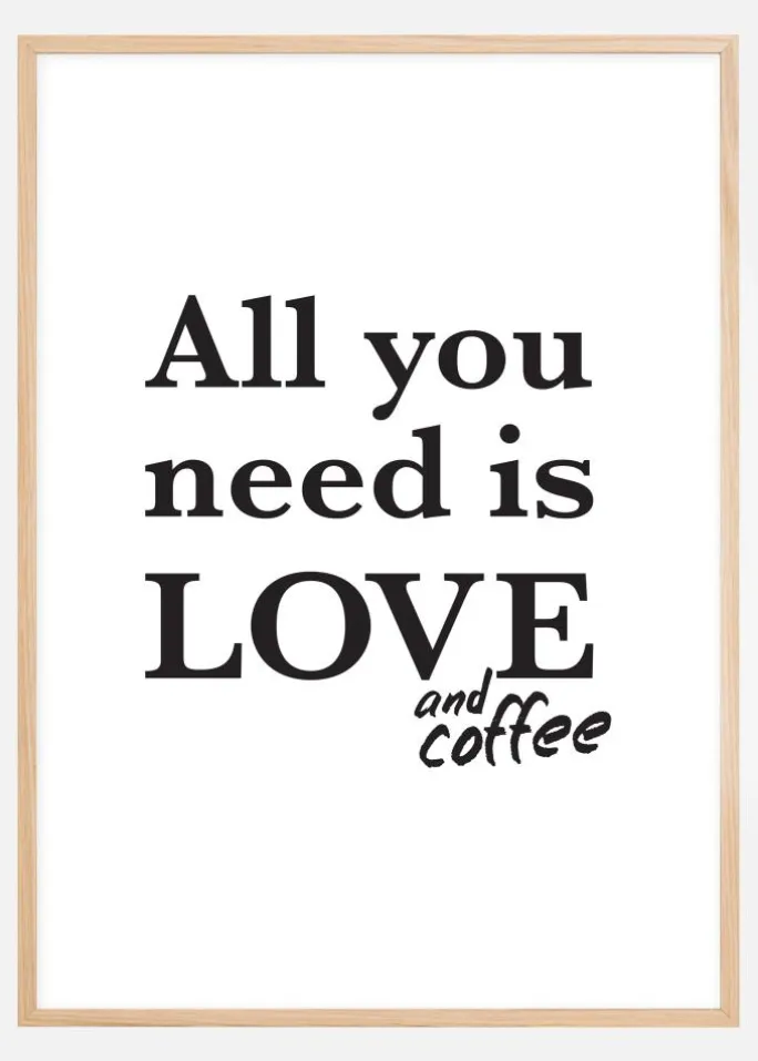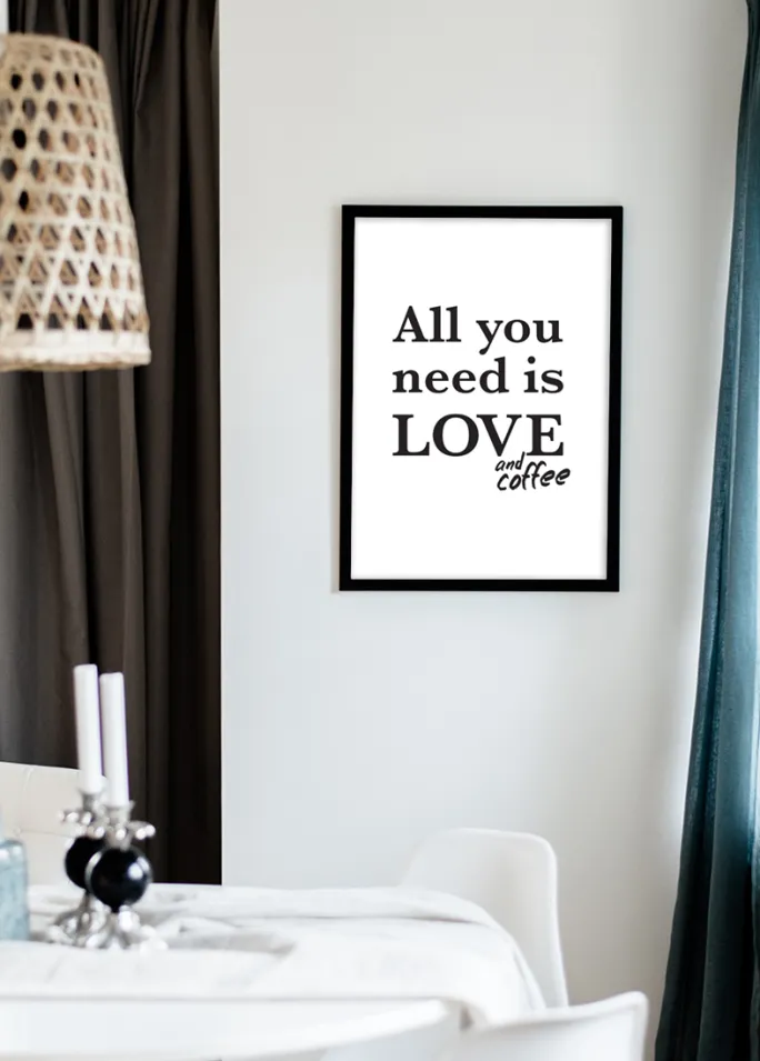 Alt du behøver her i livet er kærlighed. Og kaffe selvfølgelig! Denne charmerende plakat bliver et fint element i køkkenindretningen hjemme eller på arbejdet. Posteren er hvid med et sort tryk i form af teksten “All you need is love and coffee”. Du får indtrykket af, at “and coffee” er blevet skrevet til efterfølgende. Det sort-hvide design kombineres fordelagtigt med en flot ramme i din yndlingsfarve.