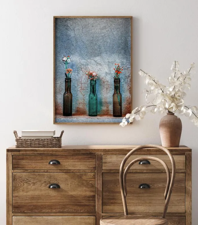 Et smukt print af tre glasflasker på en stenoverflade. Hver flaske indeholder små farvestrålende klaser af farverige blomster. De brune årer i stenene fremhæver de brune skygger fra flaskerne, der reflekterer på stenhylden. Et enkelt, men fint maleri til at hænge på en hvid væg for at tilføje den ekstra smule farve.