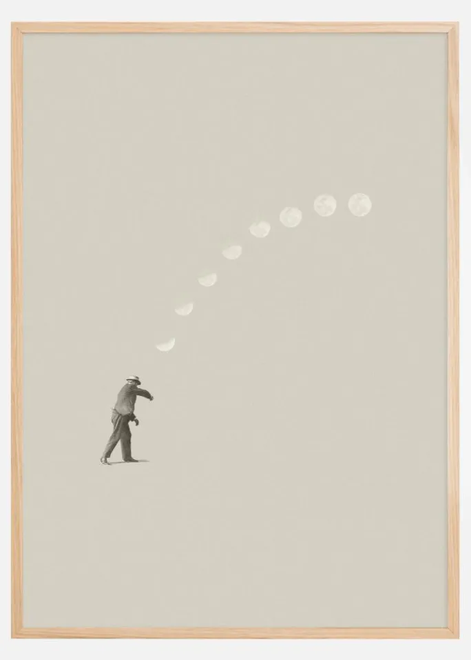 Denne poetiske plakat portrætterer en silhuet af en mand, der med en kraftfuld bevægelse kaster en måne mod himlen. Det er en scene, der fanger øjeblikket af en måne, der elegant sendes af sted og danner en bane af forskellige månefaser. Denne handling symboliserer måske drømme og ambitioner, der skydes mod uendelige muligheder. Billedets minimalisme forstærker den kraftfulde gestus og efterlader plads for beskueren til at udfylde sin egen fortælling og betydning.