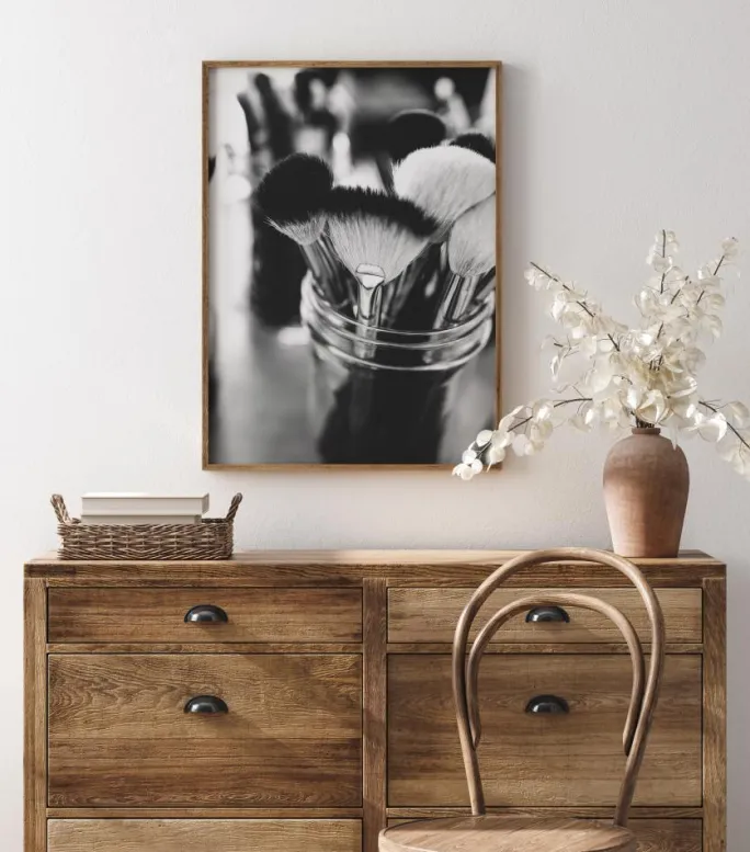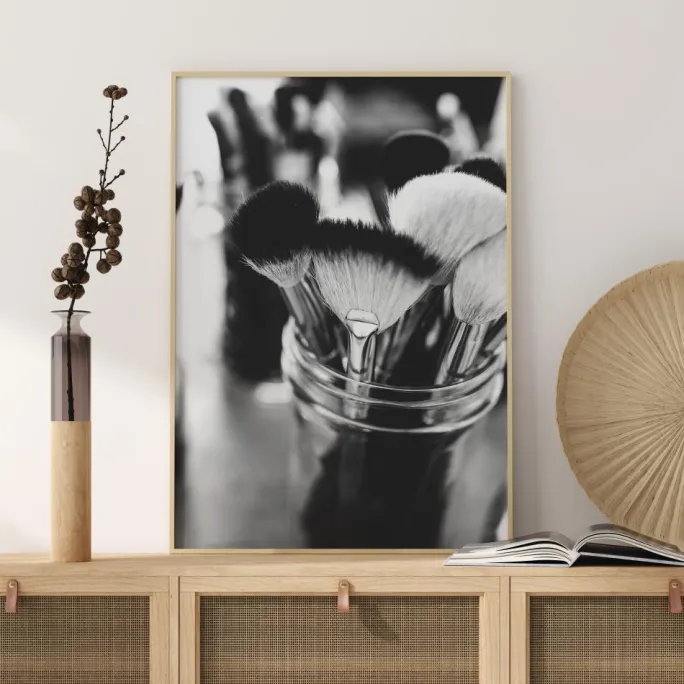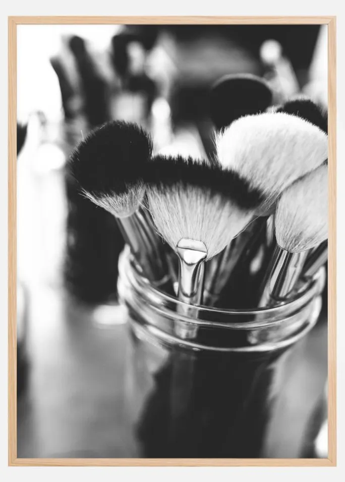 Et kunstnerisk, men sjovt print af en glaskrukke fuld af makeupbørster. Dette slående sort-hvide billede viser en række forskellige børstestørrelser. Mærk disse børsters blødhed, når du hænger dette print på væggen i dit soveværelse.