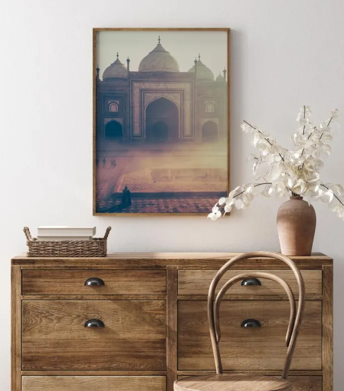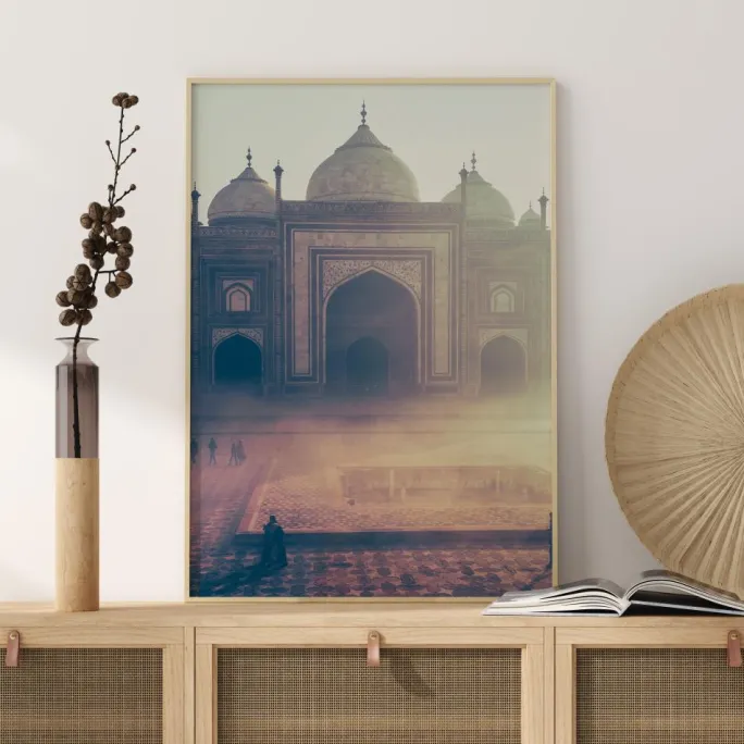 Den muslimske verdens åndelige centrum står selvsikkert over pladsen i forgrunden. En lille gruppe mennesker strejfer rundt på pladsen gennem en lysende oplyst dvælende tåge. Den største af moskéens indgange er flankeret af mindre indgange til både venstre og højre. Et fredfyldt tryk, der skaber en beroligende atmosfære.