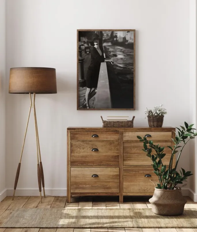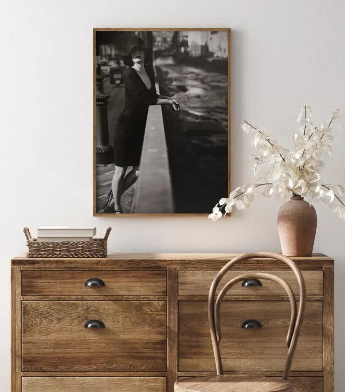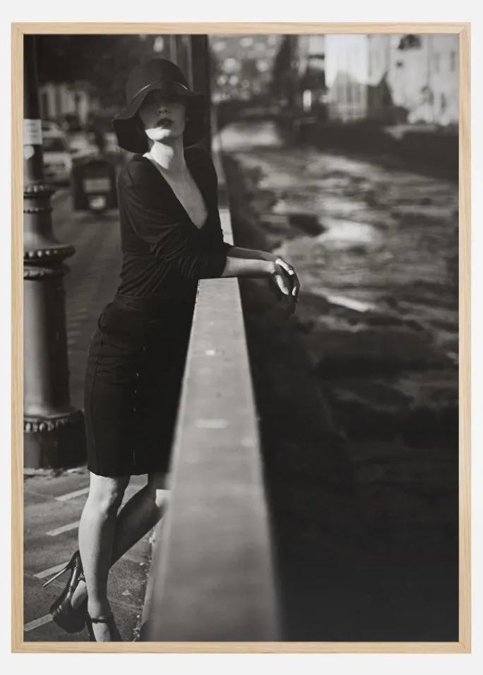 Et portræt af en kvinde, der læner sig op ad en væg. Dette fantastiske foto der oser af klasse, indfanger følelsen af afslappet elegance. Brug denne plakat til at skabe en afslappet 30’er-vibe.