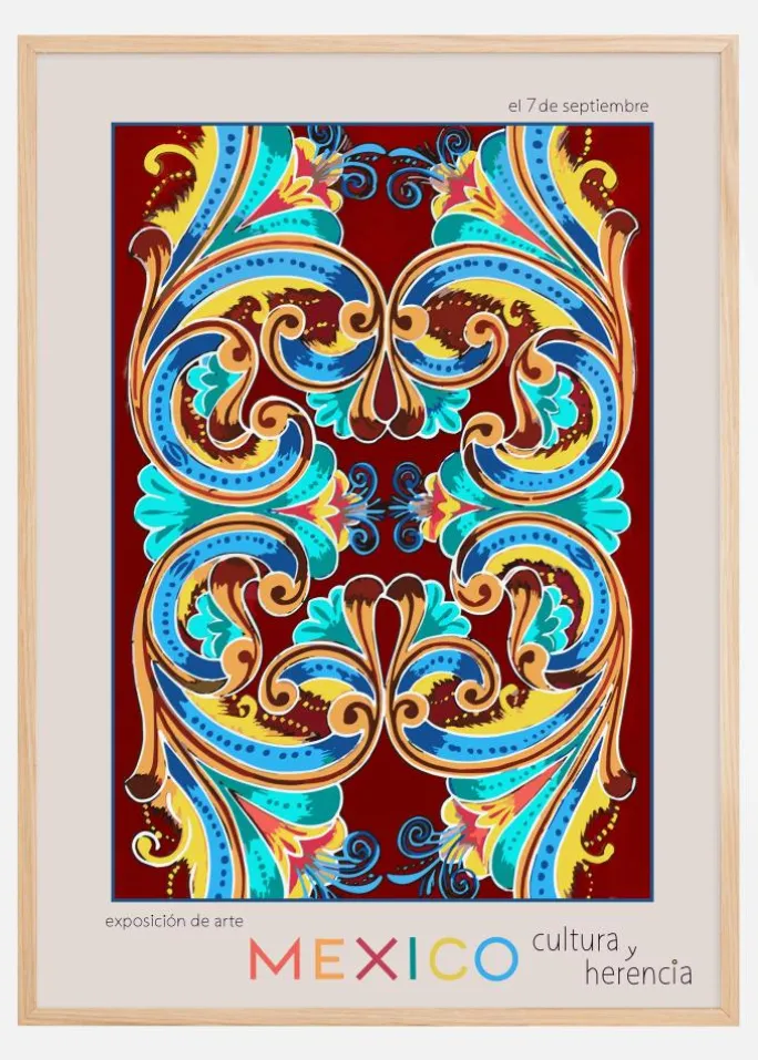 Denne livlige og farverige plakat fejrer en kunstudstilling i Mexico. Dens design er inspireret af traditionelle mexicanske mønstre, fulde af svungne kurver og eksuberante blomstermotiver, der indbyder øjet til at danse over billedet. De rige røde, gule og blå farver er typiske for mexicansk folkekunst og symboliserer nationens kultur og arv med et moderne twist.