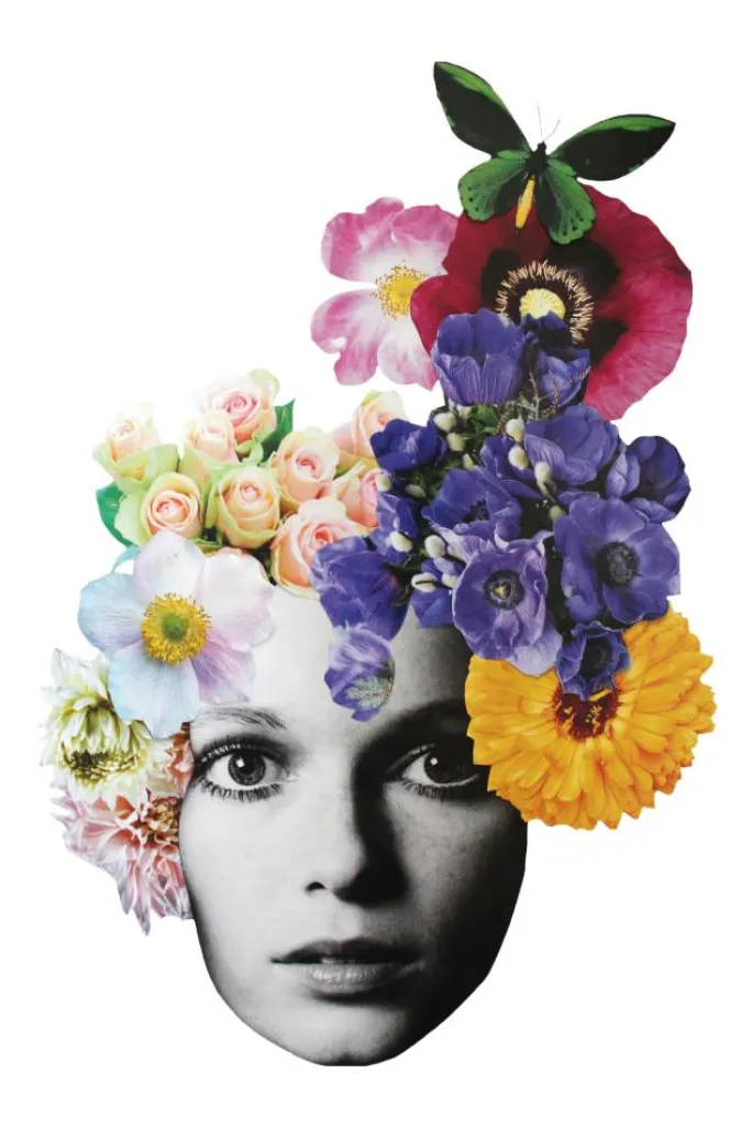 En smuk blomstret decoupage, der minder om 60’erne. En smuk farvebuket fletter sig sammen med billedet af modellens ansigt. På en hvid baggrund skaber dette print en delikat komposition, der er velegnet til en finurlig stue eller et stilfuldt badeværelse.
