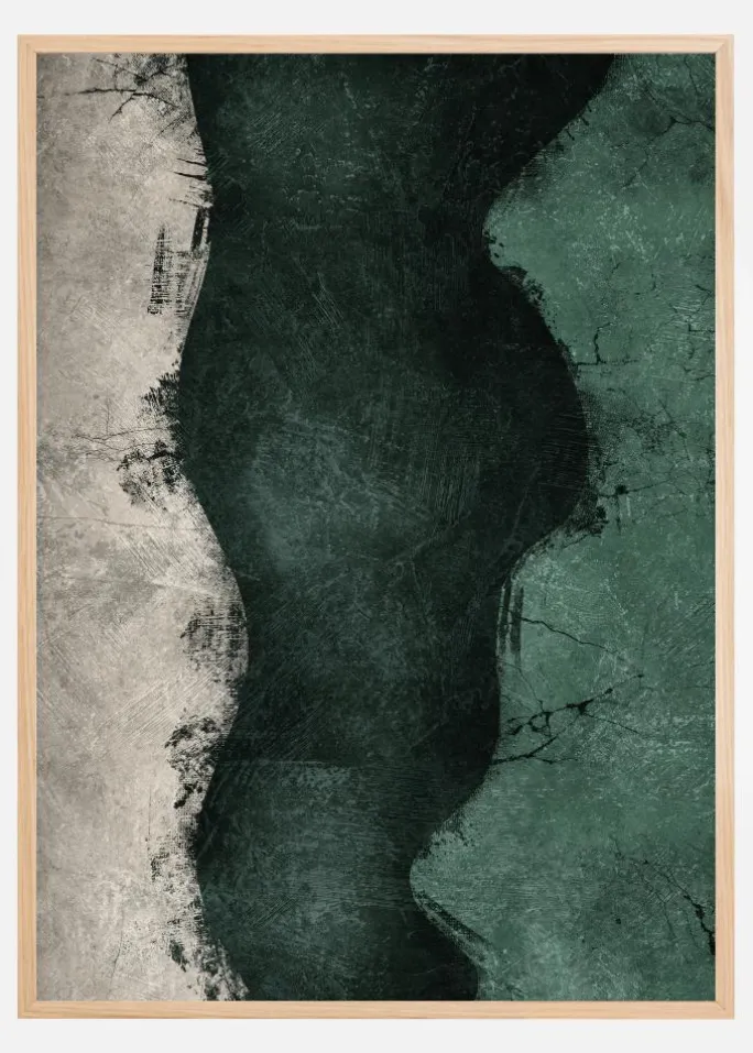 Denne plakat giver en stærk visuel effekt med sin delte komposition af teksturerede former, som ligner et luftfoto af et mørkt landskab eller en kløft mellem to verdener. Den ene side viser en intenst grøn tone med dybe teksturer, og den anden en blegere kontrasterende nuance, som tilsammen giver en fornemmelse af naturens dynamiske kontrast mellem skov og åben mark. Det er et dramatisk og fængslende billede, der leger med skygger og lys, hvilket skaber en følelse af både mysterium og fascination.