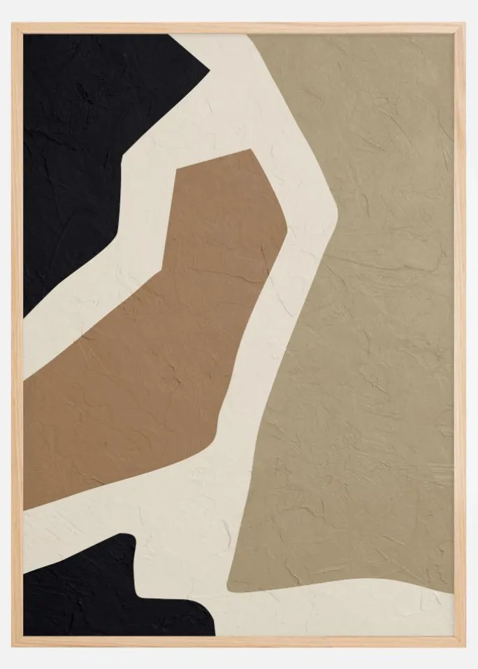 Denne nutidige plakat fremhæver minimalismens skønhed gennem dens enkle og rene æstetik. Motivets geometri består af former i en komposition, der leger med perception og rum. De store plane flader i varierende beige nuancer kombineret med dybe sorte former skaber en rolig men alligevel dramatisk effekt. Dette kunstværk er fremragende til at indføre en rolig og sofistikeret atmosfære i et rum og fungerer lige så godt i en monokrom indretning som sammen med varmere farvetoner.