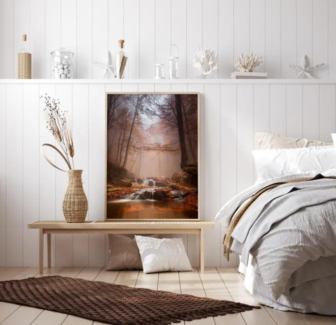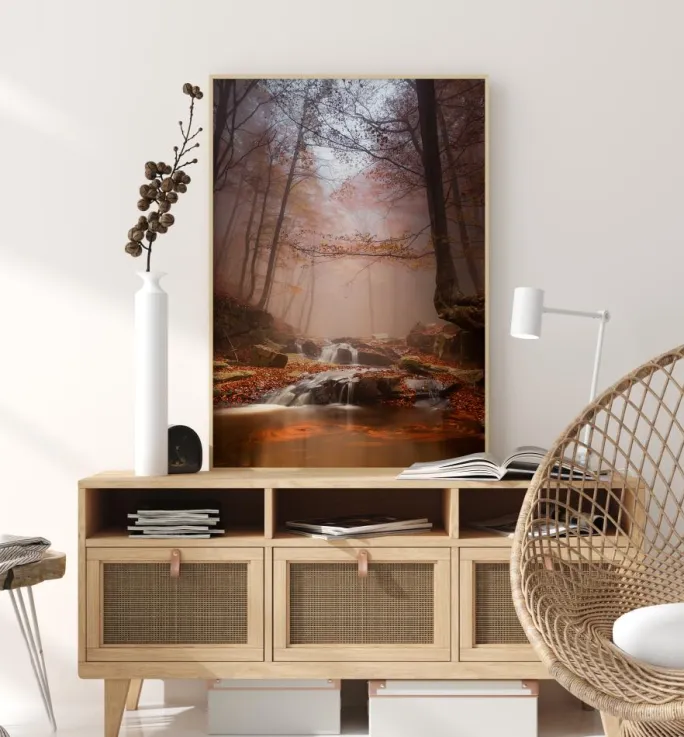 Et naturskønt portræt af en tåget skov med en smuk bæk. Tågen blokerer det direkte sollys, og kun nogle stråler lyser den røgfyldte skov op og fremhæver de brune og gule blade. I forgrunden ligger de efterårsfarvede blade på flodbredden. Klar til at give dit hjem en naturskøn stenet kuperet skovudsigt.