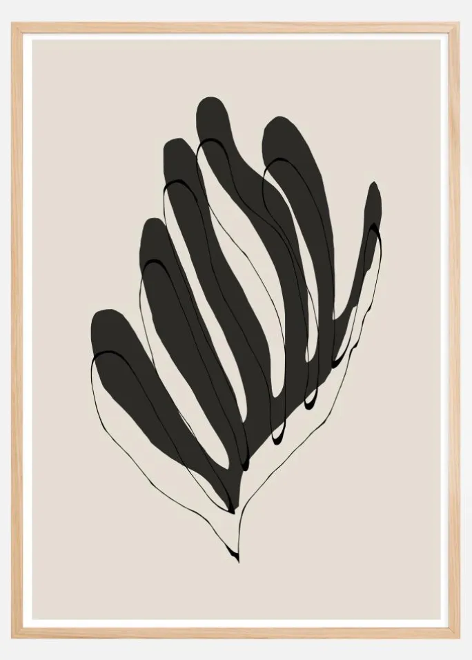 Denne plakat er et fremragende valg for den, der sætter pris på kunst med botaniske elementer men foretrækker en mere stiliseret og nutidig tilgang. Dens stilrene linjer og dristige former tilbyder et unikt perspektiv, der kan tiltrække øjet og skabe et fokuspunkt i rummet. Sort og off-white er en klassisk kombination, der gør det nemt for kunder at opdage og integrere dette kunstværk i deres hjem eller kontormiljøer, uanset om de leder efter noget, der komplementerer en enkel og sofistikeret æstetik eller noget, der skaber en stærk visuel effekt.