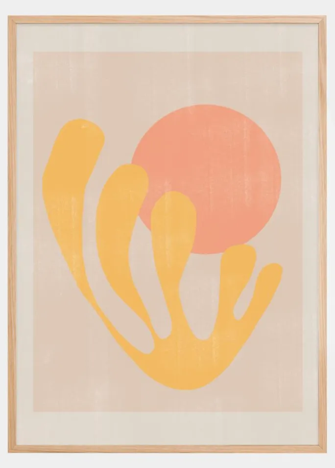 Oplev varmen og energien i denne solrige plakat, der præsenterer en legesyg og moderne fortolkning af planteliv. Med en stor koralfarvet cirkel, der ligner solen, og bløde gule former, der forestiller lysets dans på blade og blomster, tilbyder dette kunstværk en følelse af varme og liv. De varme toner og de kurvede linjer giver et indtryk af naturens bevægelse og skønhed.