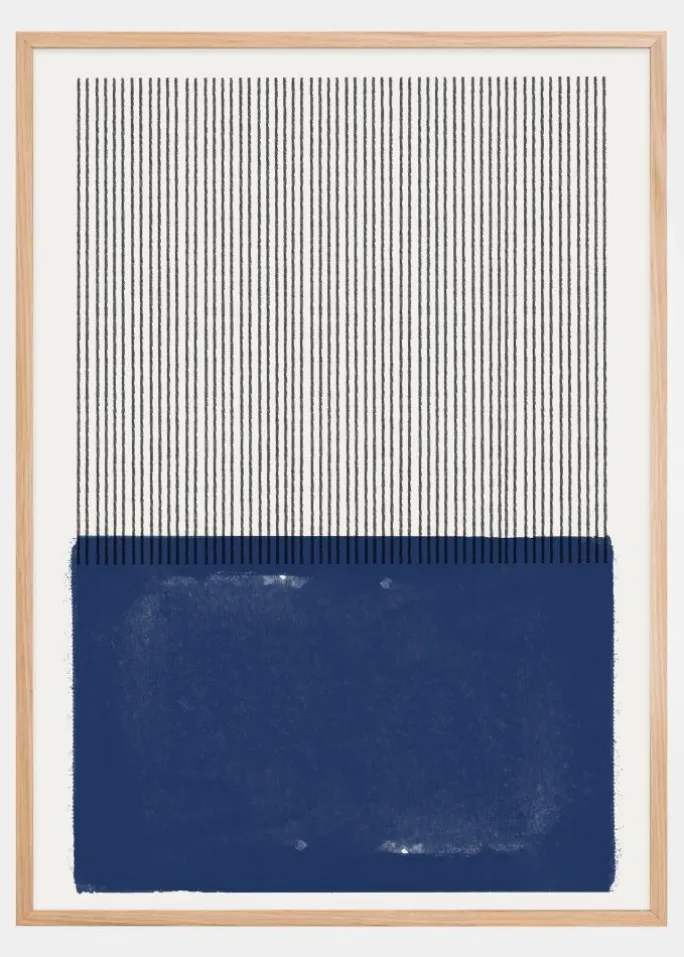 Denne plakat er en hyldest til moderne design og tekstur og præsenterer en dristig blok af mørkeblå farve nederst, som synes at bære en vægt af vertikale sorte linjer, der strækker sig opad over en lys baggrund. Kontrasten mellem den tykke blå overflade og det fine linjemønster skaber en interessant visuel spænding og giver følelsen af en urban nat mod en klar himmel.