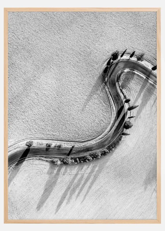 Udforsk en verden af minimalistisk elegance med vores seneste kollektion af sort-hvide plakater. Denne særlige print fanger essensen af enkelhed og harmoni gennem dens afbildning af en snoet vej, der skærer gennem et roligt og tekstureret landskab. De monokrome farvetoner i sort, hvidt og gråt er blødt balancerede, hvilket skaber en visuel poesi, der er både tidløs og moderne. Denne plakat er en hyldest til stilheden i naturen og menneskets vej gennem den. Perfekt for den, der søger et sofistikeret og moderne touch i sit hjem eller kontor.