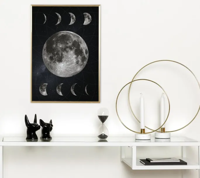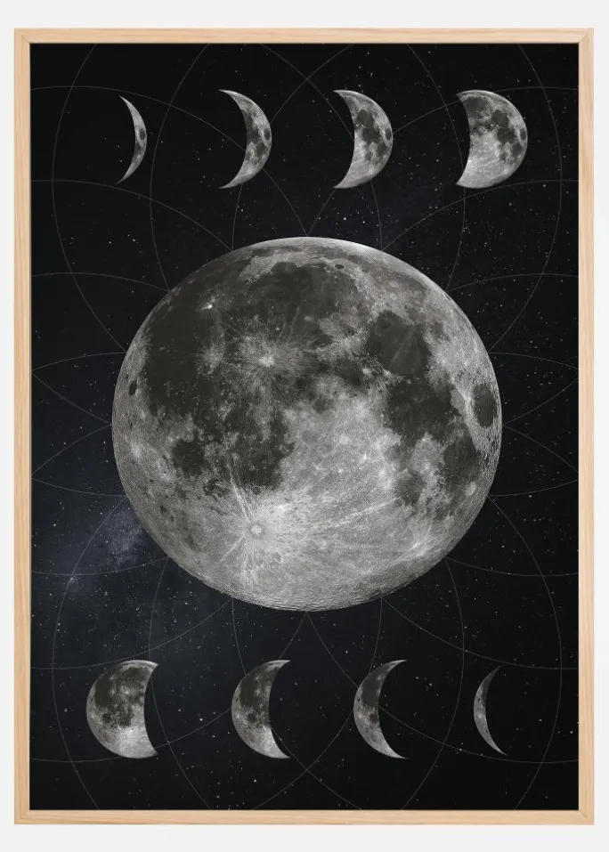 Hvilken er din favorit blandt himmellegemerne? Denne stilfulde poster forestiller vores smukke måne og alle dens faser, som de ser ud afhængigt af, om du befinder dig på jordens nordlige eller sydlige halvkugle. Selv månen er i gråskala, mens stjernehimlen bagved hælder let mod blåt.