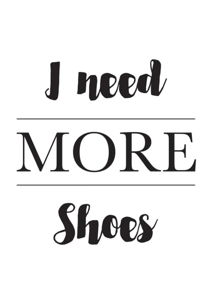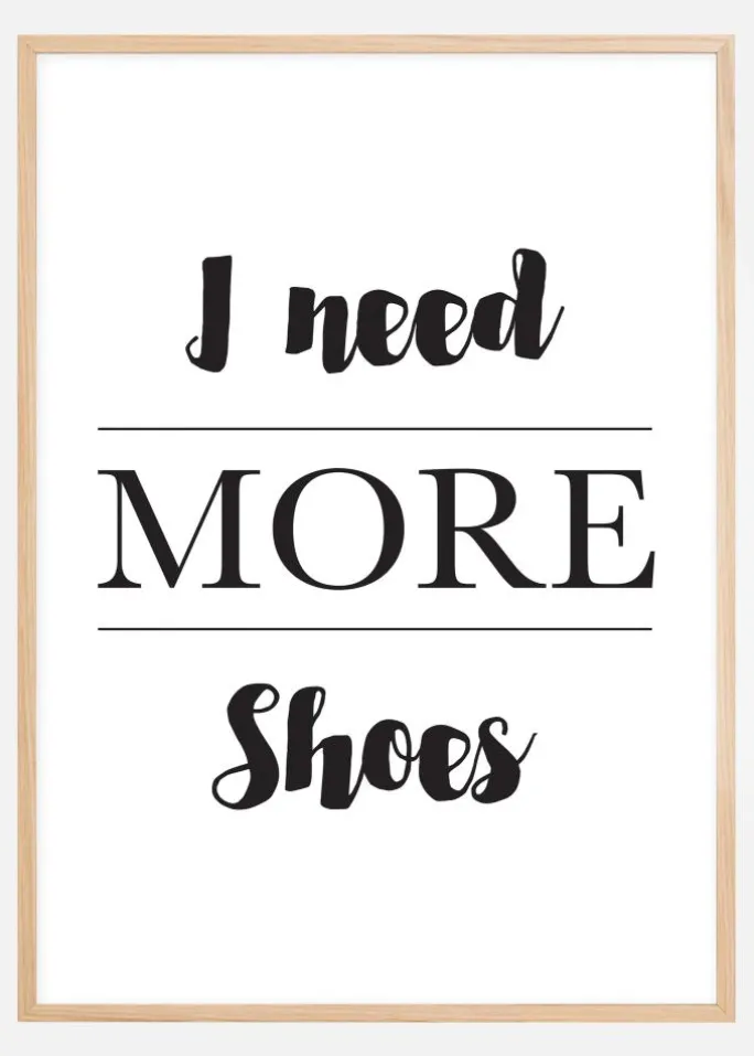 Hvis du er en stolt shopaholic med en forkærlighed for sko, har vi her en plakat, der passer perfekt til dig! Det charmerende motiv er sort og består af teksten “I need more shoes” trykt med 2 forskellige skrifttyper. I midten løber to dekorative sorte linjer. Det stilrene og enkle design passer perfekt sammen med en sort eller hvid ramme. Hvis du vil gøre den endnu mere personlig, vælger du en ramme i din yndlingsfarve. Plakaten findes i flere forskellige størrelser, så du nemt kan finde en, der passer til netop dit skrivebord eller din væg.