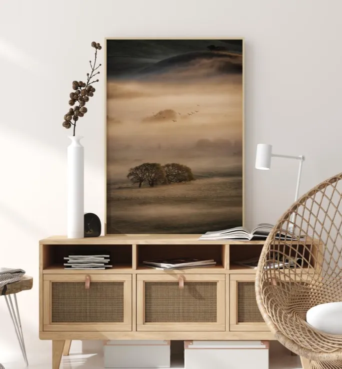 Et hypnotiserende foto af en tåget morgen på en bjergside med fugle, der smukt brager den gule sky. De bløde brune toner i printet skaber en afslappende atmosfære, hvor du næsten kan fornemme naturens friskhed. Bring naturens skønhed ind i dit hjem med dette vidunderlige morgenlandskab.