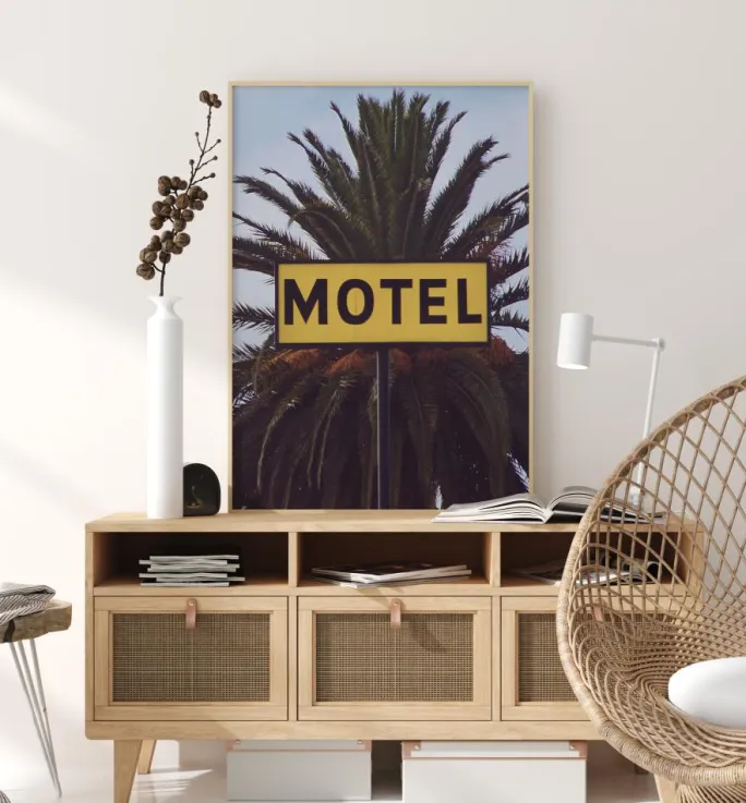 Et enkelt og klart print af et Motel-skilt foran en stor palme, der står foran den blå himmel. Den sorte skrift er skrevet på den gule overflade af plakaten. De store palmegrene har blade i forskellige farver fra grønt til lysebrunt. Et perfekt print til en motelreceptionsvæg.