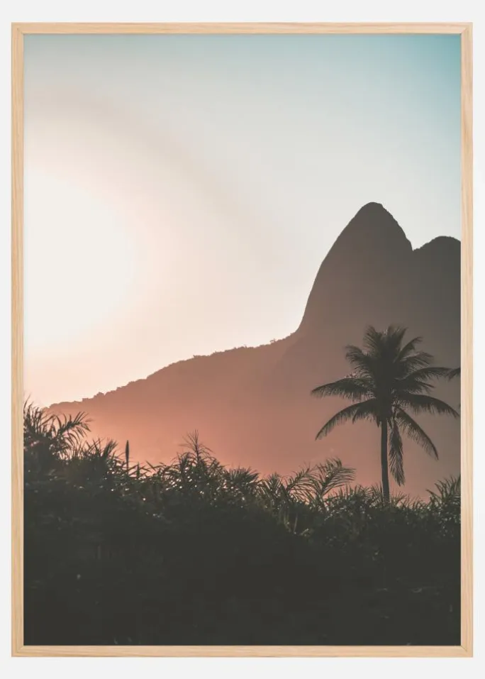 Et fantastisk fotografi af en bjergkæde under solnedgang. Den smukke lyseblå himmel fremhæver en solitær palme omgivet af mindre træer i forgrunden. Solen danner orange stråler, der er klar til at varme dit hjem. Et perfekt print til at hænge på en bar væg