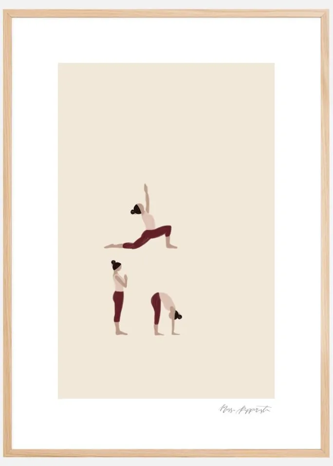 Et kunstværk af en kvinde, der praktiserer yoga. Set på en cremefarvet overflade er kvinden i tre forskellige stillinger. Alle stillinger er udført perfekt med kvinden på fødderne hele tiden. Det perfekte print til at hænge i en yogaklasse eller i et fitnesscenter.