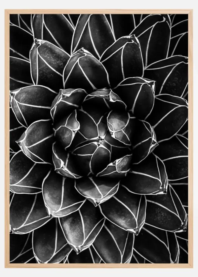 En sort/hvid plakat af en smuk blomst. De grå kronblade med hvide striber krøller den centrale del, mens de ydre viser kunstens fejlfrihed. Du har ikke råd til at gå glip af den skønhed, der følger med, når du hænger plakaten på væggen i din stue.