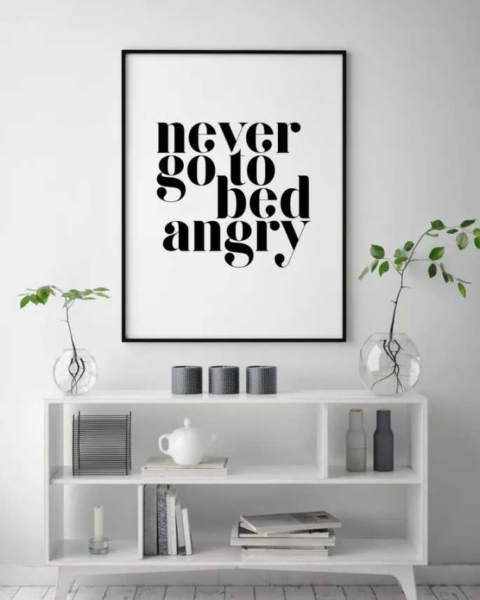 En plakat med den berømte sætning “gå aldrig vred i seng” trykt med små bogstaver og med fed skrift. Skriften er med sort blæk på en hvid overflade. På din væg i soveværelset minder denne plakat dig altid om at være i fred, inden du sover. Et perfekt print til at gøre det sundt og behageligt at sove.
