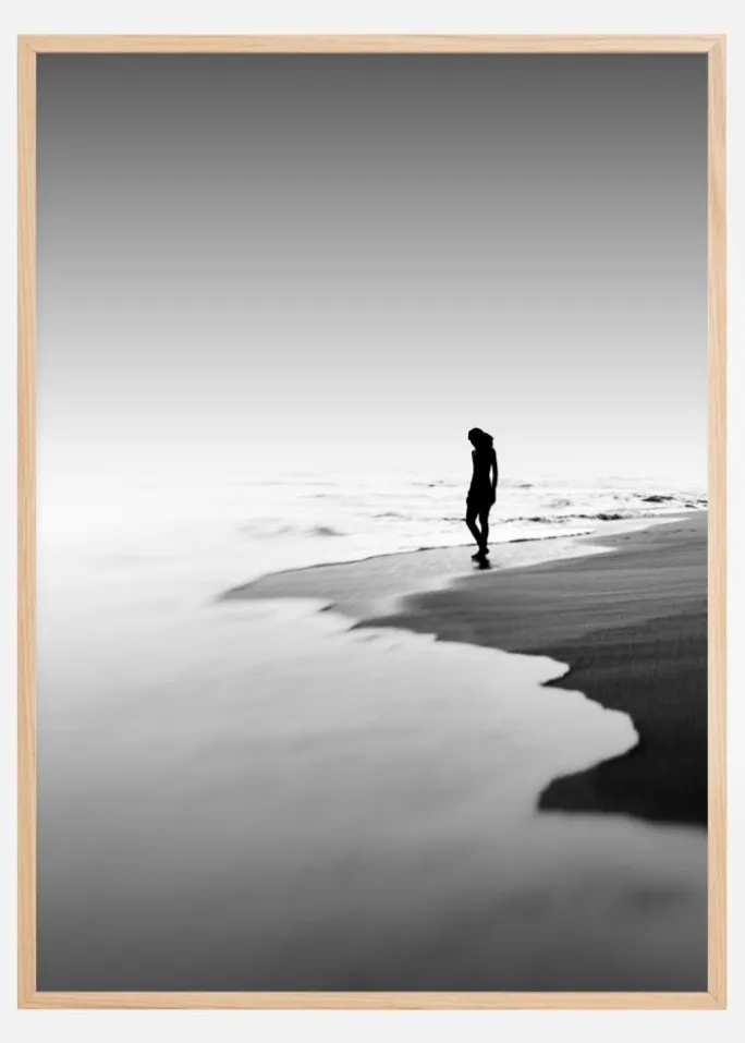 Et sort-hvidt nærbillede af en kvinde, der går ved havet. De bløde bølger bryder blidt mod sandet, mens kvinden går barfodet langs stranden med vinden i håret. Sollyset skaber en skygge på sandet. Det perfekte print til strandelskere i hjemmet.