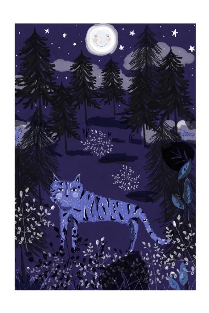 Et sjovt print af en skov om natten med en smilende måne og en tiger. Den lilla himmel er fyldt med skyer og glitrende stjerner. I baggrunden står fyrretræerne højt, mens månen kigger ned på dem. De mørke lilla og grønne farver skaber en varm følelse, mens de små hvide buske giver printet ekstra lys. Et perfekt print til dit børneværelse.