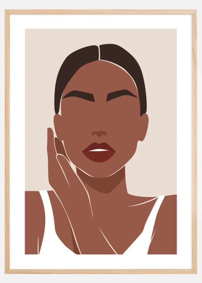 Denne æstetisk tiltalende plakat afbilder en kvindelig silhuet i en stiliseret og forenklet form. Billedet er opbygget med et begrænset farvespektrum bestående af jordnære toner, fra lys beige til dybere brun, hvilket giver en varm og indbydende følelse. Kvindens holdning er afslappet og eftertænksom, hvilket tilfører en følelse af ro og selvsikkerhed til portrættet.