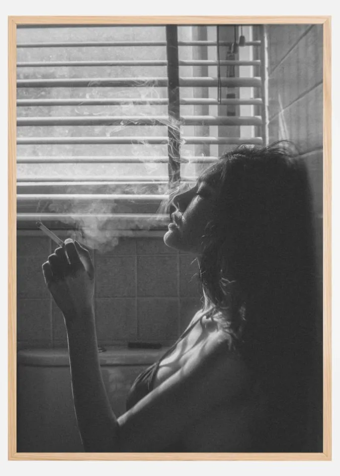 Et cool foto af en kvinde, der ryger på et badeværelse. Med lyset, der skinner gennem vinduet, ser kvinden ud til at være meget afslappet. Siddende på gulvet ser denne unge dame ud til at nyde et øjebliks fred. Dette sort-hvide print skildrer en følelse af mystik. Hvad går der igennem denne kvindes hoved?