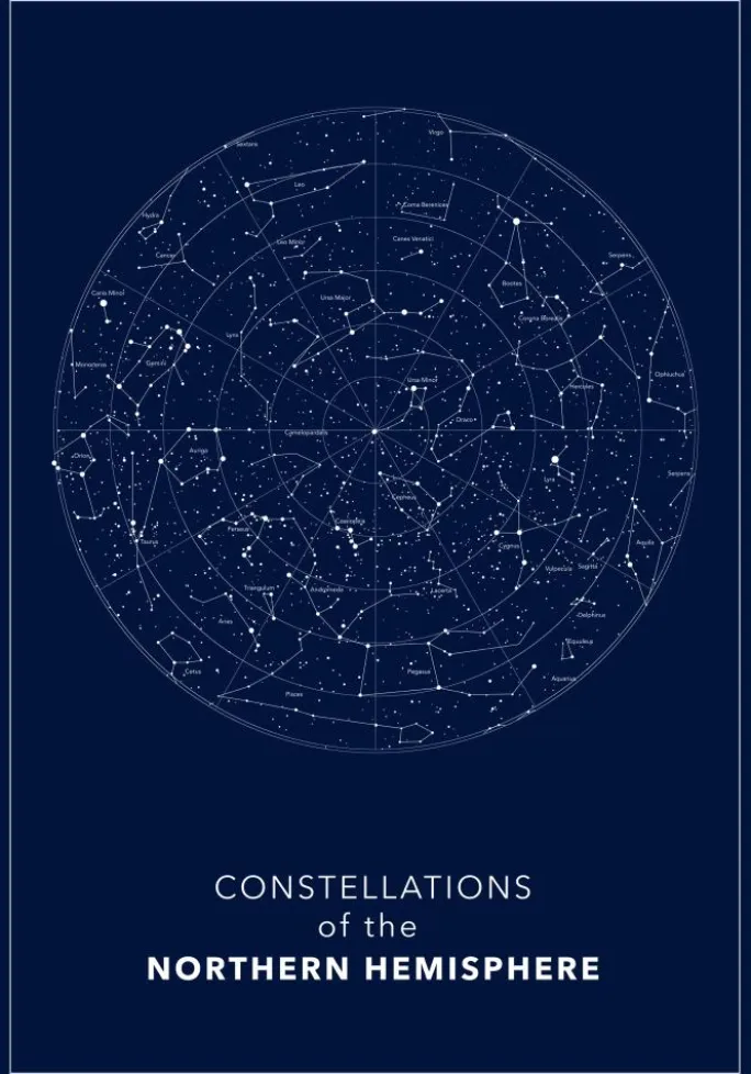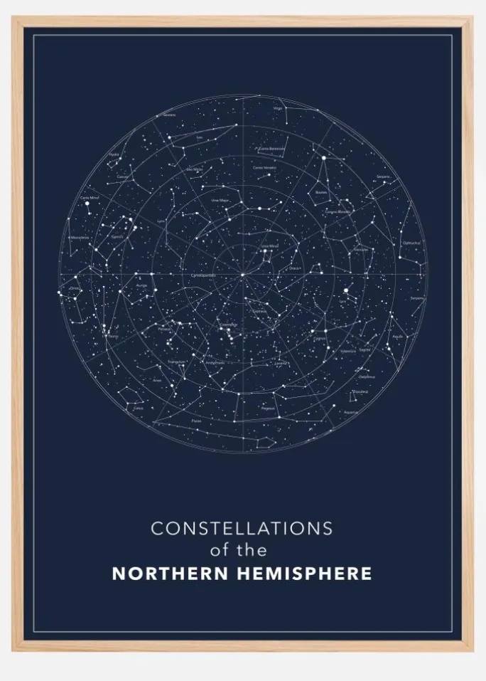 En glitrende plakat af en hvid cirkel med konstellationer fra den nordlige halvkugle. Stjernebillederne er fremhævet med en svag hvid streg med navnet skrevet under hvert enkelt stjernebillede. Set på en mørkeblå baggrund er dette en meget klar forklaring på den nordlige halvkugle. Et ideelt print til at hænge i et studie.
